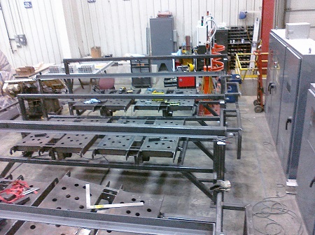 Mid way thru fabricating this production line that feeds parts on our custom designed vacuum belt system.