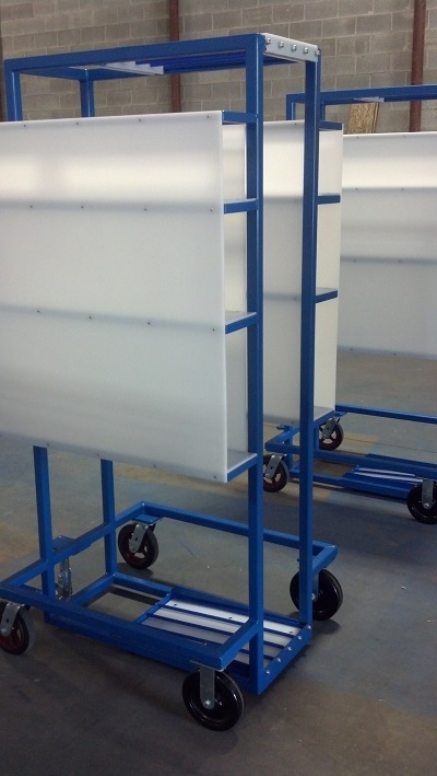 Fabricated carts custom designed to transport specific parts around a production facility.