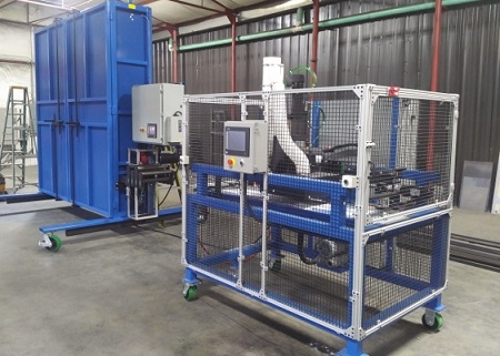 A 5 axis servo driven gantry grips a part from the previous machine and loads it into a processing vessel which is RFID tracked thru the following processes.